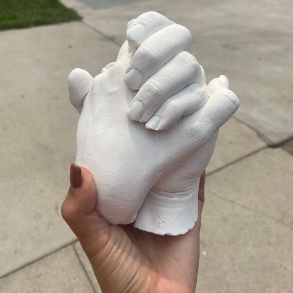 The mold sets in just 3-5 minutes around your hands. The casting stone takes 3-6 hours to fully cure. You can leave it overnight and reveal your finished sculpture the next day.